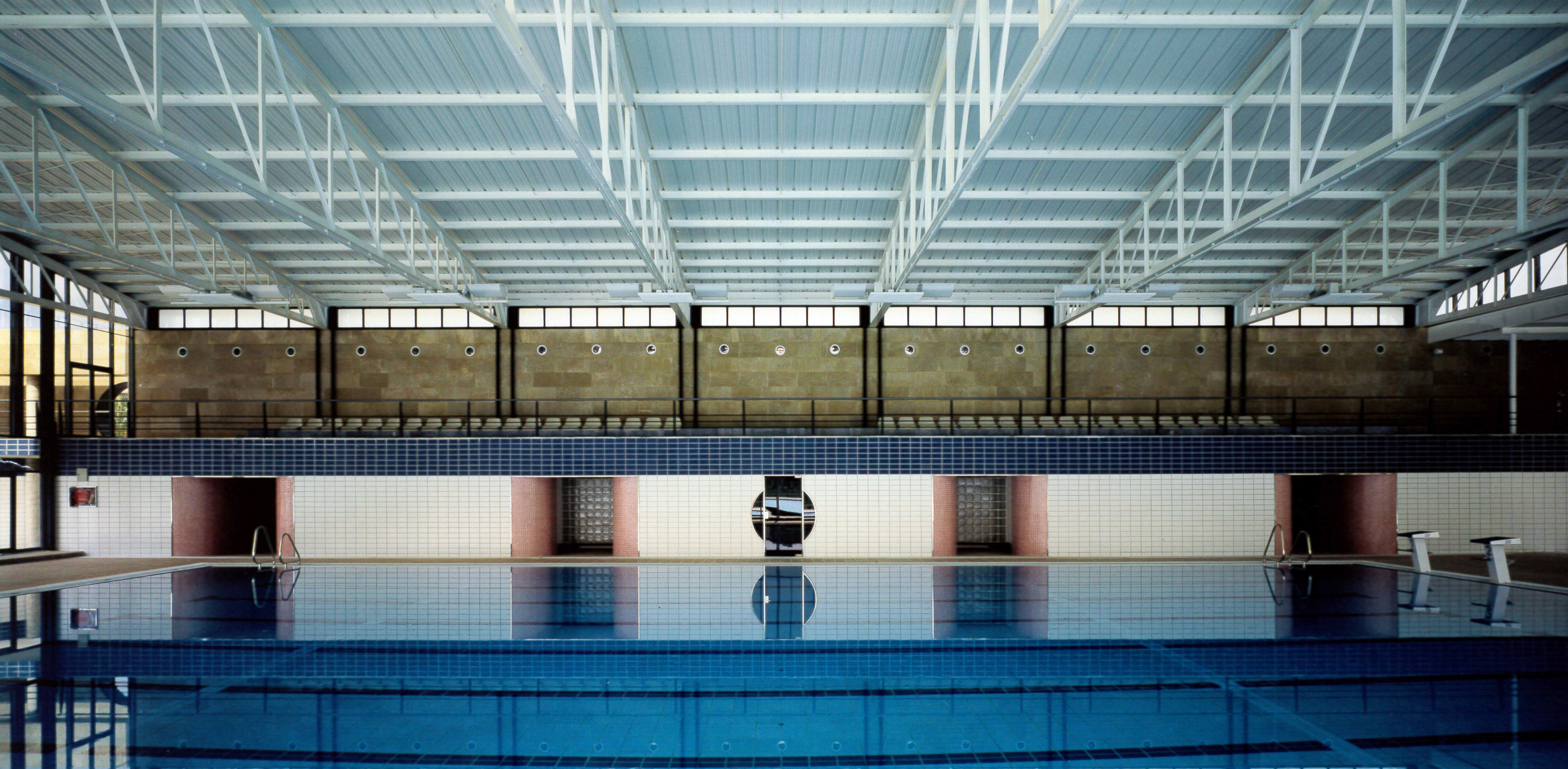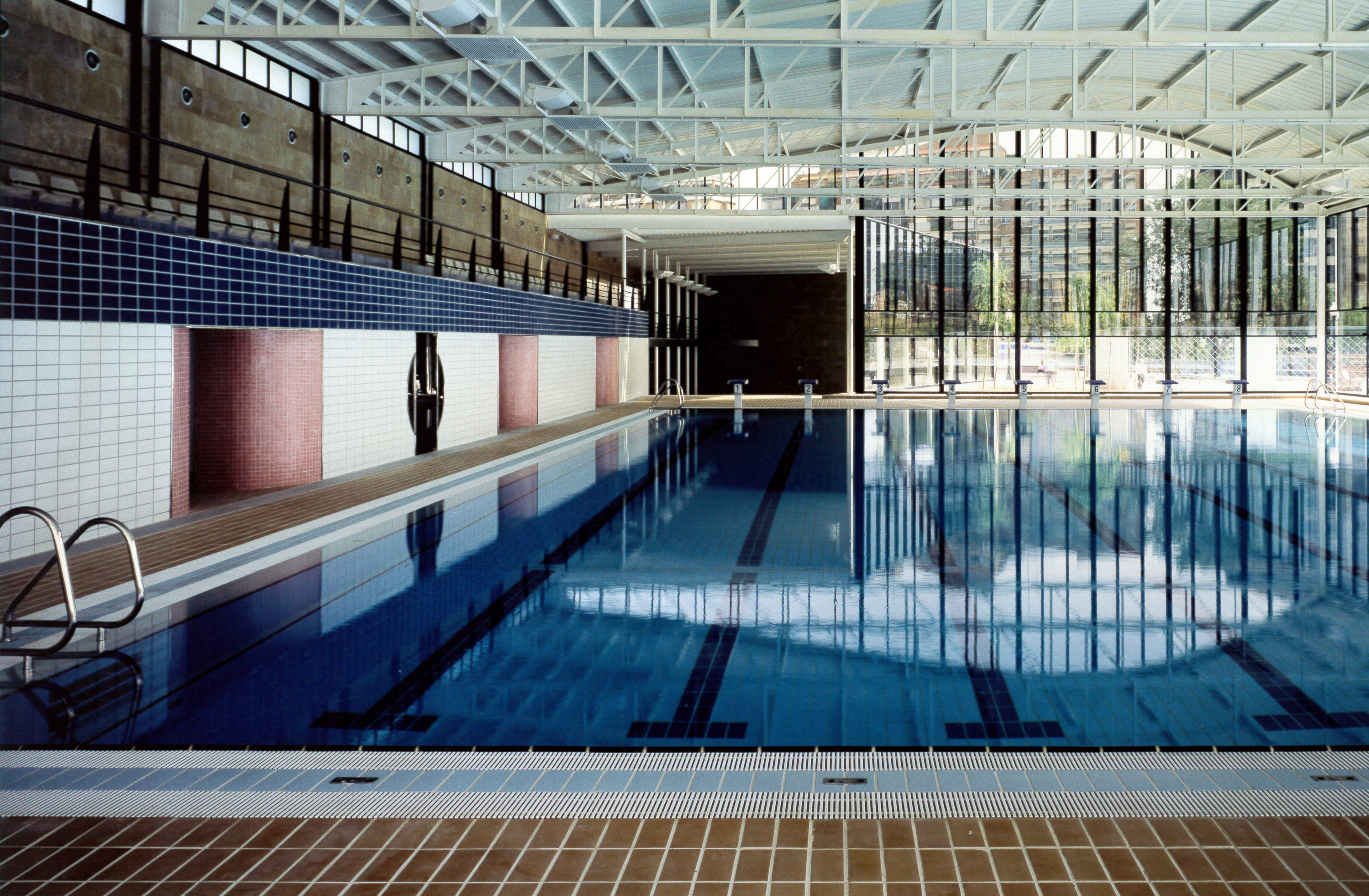 BARCELONA, 1992 El diferencial funcionament interior (hivern/estiu) piscines cobertes, al aire lliure, impedeixen sortosament un tractament unitari i de volum complet, el que fa que s’hagi optat per una organització de diferents volums que només a través d’una intervenció radical i vertebrada pot arribar-se a la integració maclada dels seus espais. Neix així l’idea d’oposar a l’edifici Palestra, per la seva cara sud, un llarg doble mur auster i carent d’apertures, el qual permet recolzar els volums orgànics dels diferents usos interiors. Per obtenir el millor assolellament, la bassa de bany exterior s’obra al sud formant un ampli cercle el qual es observat des de la superfície de sorra blanca de la seva vorera.